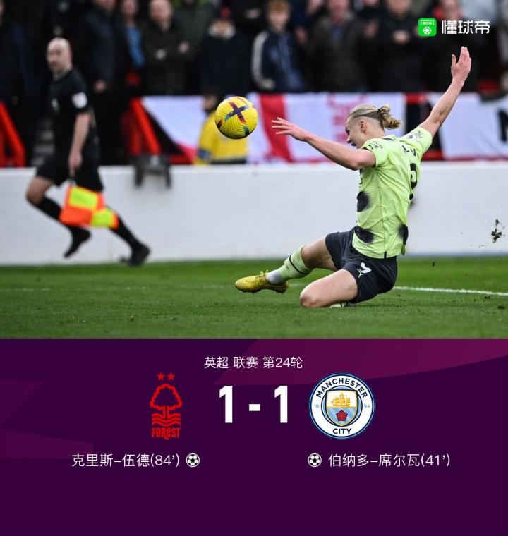 第84分钟,吉布斯-怀特送出助攻,伍德破门扳平比分,诺丁汉丛林1-1曼城!
