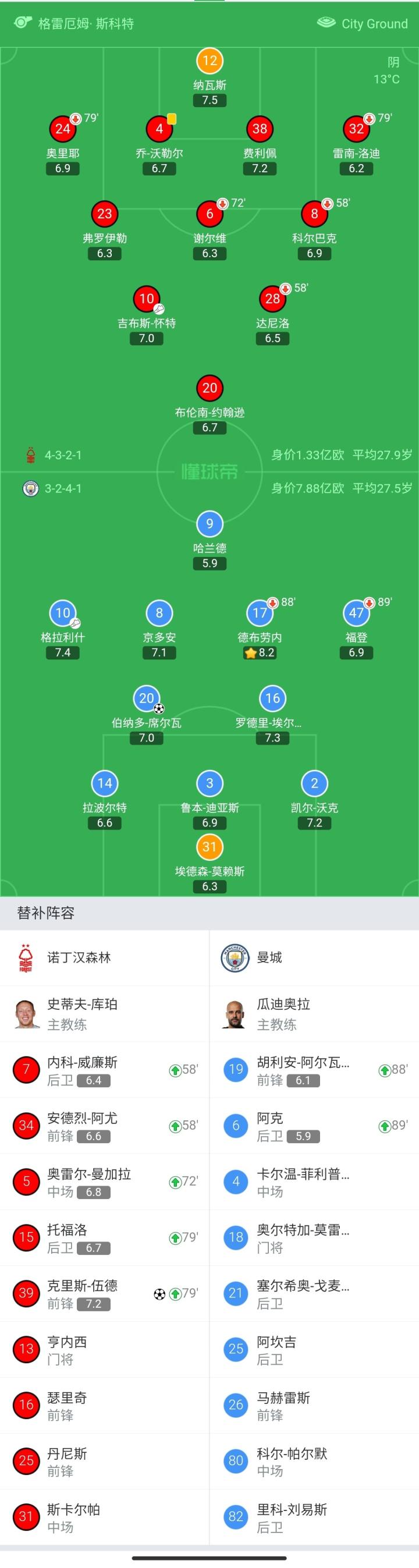 曼城首发:31-埃德森、2-凯尔-沃克、3-鲁本-迪亚斯、14-拉波尔特、20-伯纳多-席尔瓦、16-罗德里、17-德布劳内(88′19-阿尔瓦雷斯)、8-京多安、47-福登(89′6-阿克)、10-格拉利什、9-哈兰德